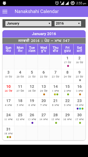 Punjabi Calendar 2023 is very easy to use and feature rich. It supports Gregorian calendar of year 2015-2023 and Nanakshahi samat 546 - 555.
