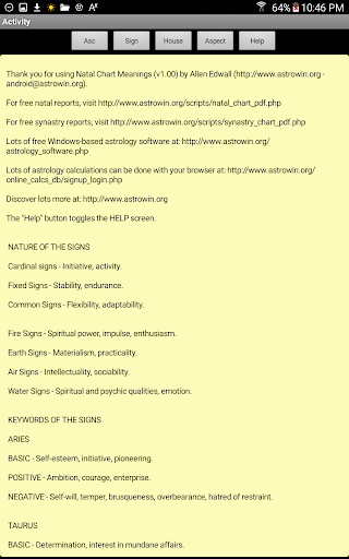 Students of astrology need to learn the meanings of the planets, signs, houses, and aspects in order to properly understand the information that a natal horoscope is trying to convey. This handy program will interpret any combination of these factors so you can improve your ability to analyze any natal horoscope.