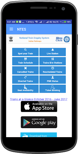 NTES-National Train Enquiry System (Indian Railways) app for travelers using railways for taking holiday vacation trips, official trips, tours, and daily commute. Site provides train-running related and real-time status queries for all trains of India.