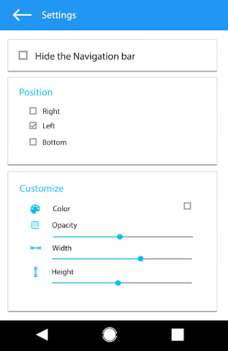 Navigation bar with back, home and recent button at the bottom of the screen. Create your custom navigation bar with desired colors height and width. Navigation bar to protect your buttons and access action quickly. Fast, smooth and totally free navigation bar which shows back button, home button and recent button at the bottom of the screen. Ultimate control navigate which renders quick navigation with arrow keys to come back at home screen. Easy controls navigating to back, home and recent apps on screen. Place horizontally or vertically the best navigation bar which provides easy swipe up and swipe down navigation bar as assistive touch.