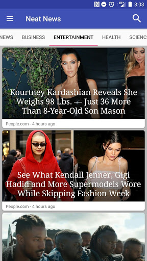 The Neat News categories: Top News, Business, Entertainment (People, Gossip, ...), Health, Science, Sports (including Soccer, Football NFL, Hockey NHL, Basketball NBA, Baseball MLB, but also Cricket, etc...) and Technology.
