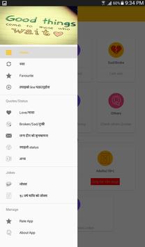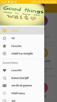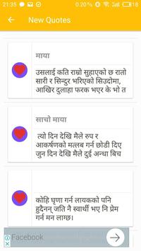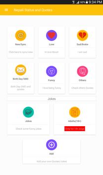 In this app,you can read nepali quotes, nepali status ,Nepali BirthDay sms ,Nepali jokes, and Nepali Adult jokes. You can feel all the quotes and status with your feelings.Also you can share your feeling to the world through this application.you can send different nepali quotes and status ,Jokes ,SMS etc so that other will enjoy your status and quotes.
