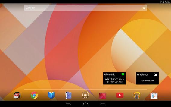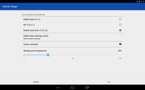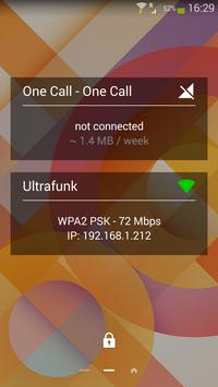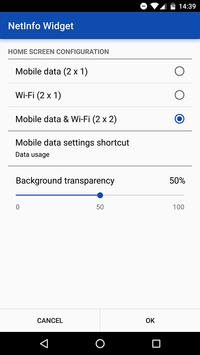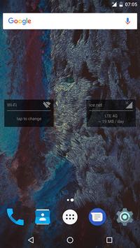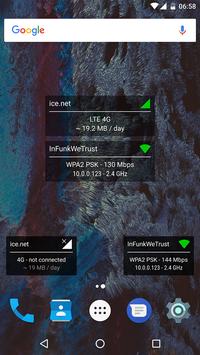 NetInfo is an easy to use single or dual widget with a clean design that shows the current Mobile data and / or Wi-Fi connection details with quick shortcuts to change the settings for each of them and easy access to turn any of them ON or OFF.
