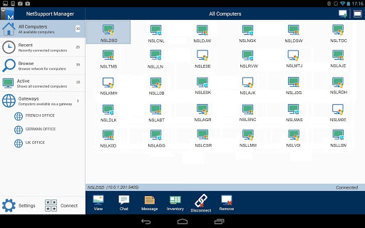 The mobile Control allows a user to quickly search and connect to both local computers by either IP address or PC name, or to browse, connect and view remote computers utilizing the free NetSupport Manager Internet Gateway component.