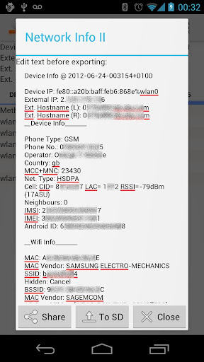 •Current mobile Cell and any neighbours, along with their signal strength, location info and type.