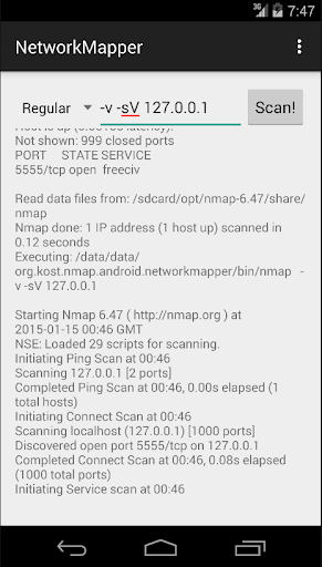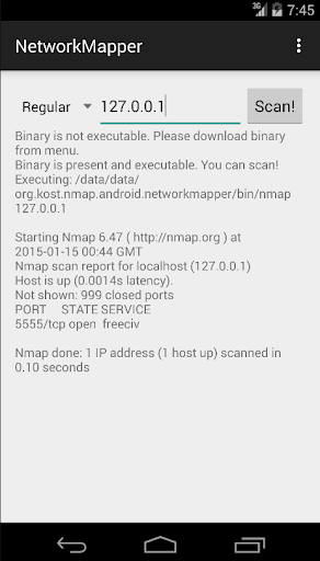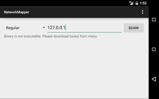 Network Mapper is unofficial Android frontend for well known Nmap scanner. Frontend will help you to download and install Nmap as well as use it.