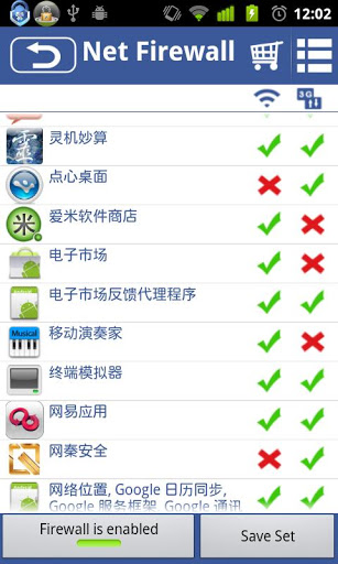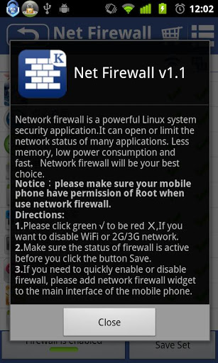 Network firewall is a powerful Linux system security application.It can open or limit the network status of many applications. Less memory low power consumption and fastNetwork firewall will be your best choice.Noticeplease make sure your mobile phone have permission of Root when use network firewall.Directions: 1.Please click green to be red ,If you want to disable WiFi or 2G3G network. 2.Make sure the status of firewall is active before you click the button quot;Savequot;.3.If you need to quickly enable or disable firewall, please add network firewall widget to the main interface of the mobile phone.This is one function of King Kong lock You can get powerful system tools box by search 39;King Kong Lock39;.