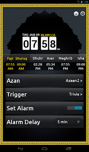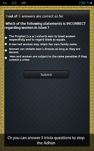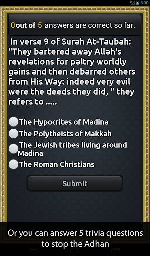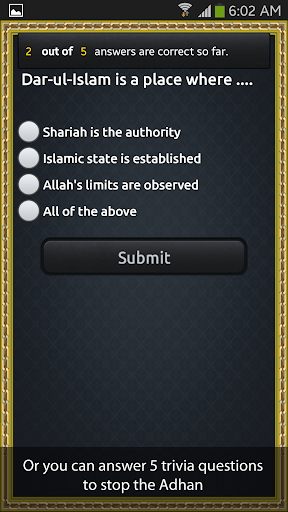 1. Trivia: if you choose this option you will have to answer 5 islam-related questions correctly before the adhan shuts off.