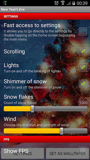 Simple live wallpaper for Christmas holiday! You can specify a number of snowflakes, direction and speed of wind. In addition, you can specify whether snow shimmers and lights of Xmas tree blink or not.