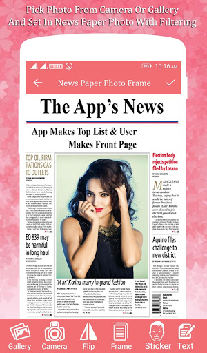 You will create news from newspaper photo frames. Set your photo in newspaper frames and set a frame in wallpaper in your screen, and save, share a social media.