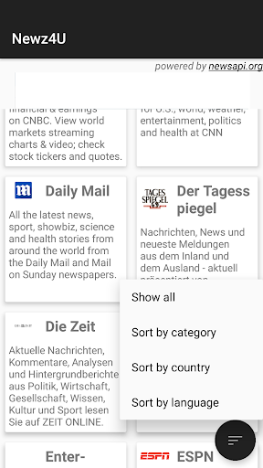 Latest news headlines from news channels around the world which can be sorted by category, country and language.