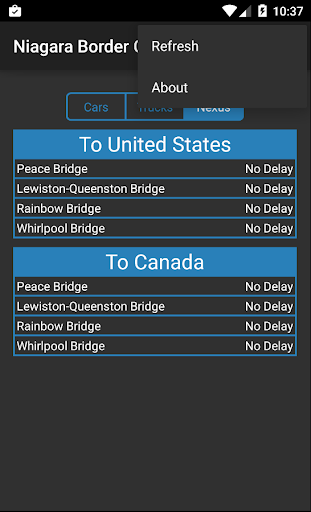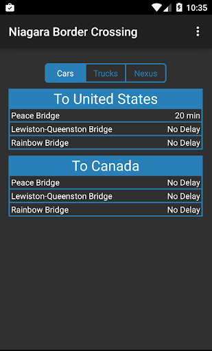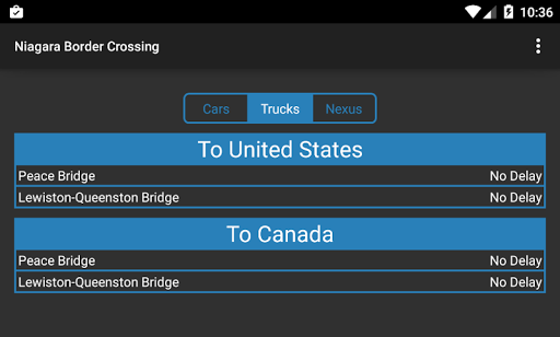 An app showing wait times for border crossings over the Niagara River between the United States and Canada. Wait times are shown for all four of the bridges between western New York and southern Ontario. These include the Lewiston-Queenston Bridge, the Whirlpool Rapids Bridge, the Rainbow Bridge, and the Peace Bridge. Separate times are shown for cars, trucks, and also for those using the Nexus lanes.