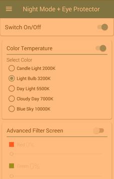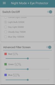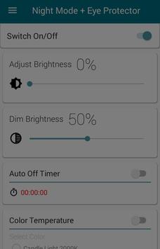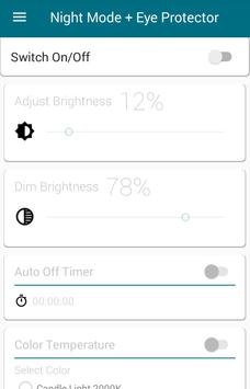 Night Mode Eye Protector main goal is to reduce the brightness of your screen lower than you can achieve with the default settings. This application applies an overlay filter that acts as a dimmer to darken the screen. It helps to avoid headache and eye pain in a dark environment or at night .