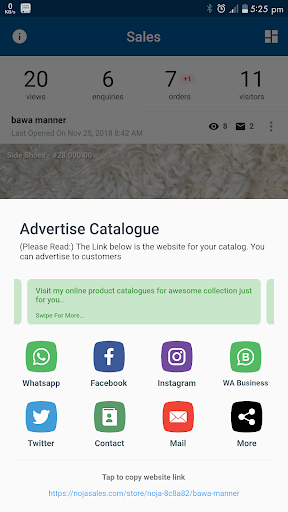 Noja sales is an online sales enforcer where store owners can create online catalogs & collections and share to a wide range of people, friends soon to be customers on social media platforms, email, phone etc.