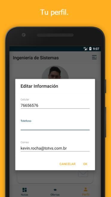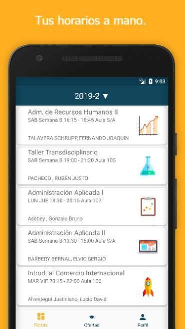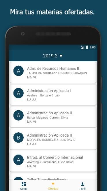 This application contains views of the subjects enrolled in a particular semester, which is chosen with the student and his career. So you can also see their schedules and the progress made with the visualization of their subjects in their academic record. See the courses offered for the next academic semesters.