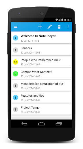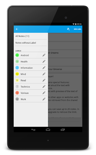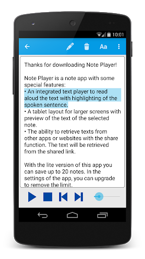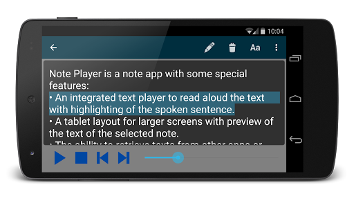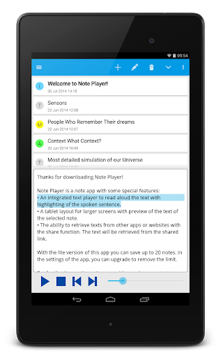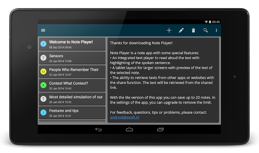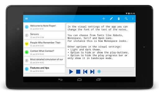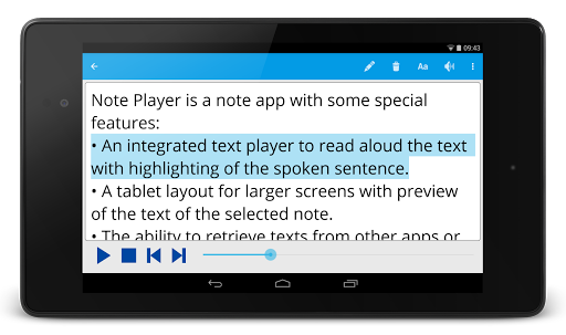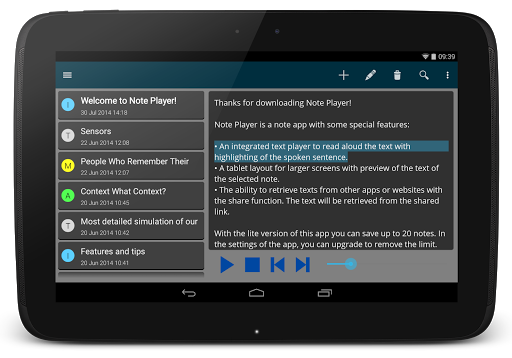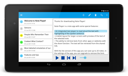 Note Player is a note taking app with special features, like an integrated text player that can read aloud, a tablet layout with preview of the text of the selected note and the ability to retrieve texts from other apps or websites.