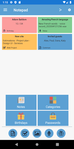 Smart notepad makes it easy to capture your thought, pictures, voice records, checklist, birthdays, logins, and passwords. You can easily organize it and find it quickly later. The notepad helps you to keep all information with you.