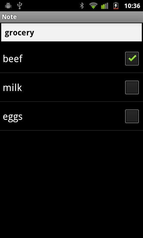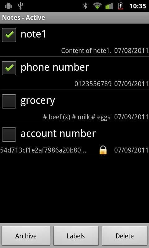 Features: encrypt notes, send notes by email/sms/g+, backup/export to SD card (/sdcard/notes), attach pictures, compose to-do list notes (starting every line of a note with "#"), reminder, organize notes with labels, import notes from SMS (to provide this feature, the app needs the permission to read SMS).