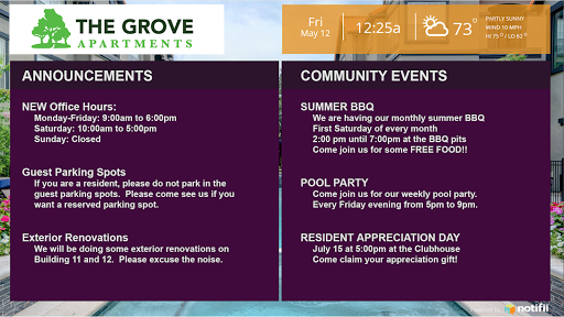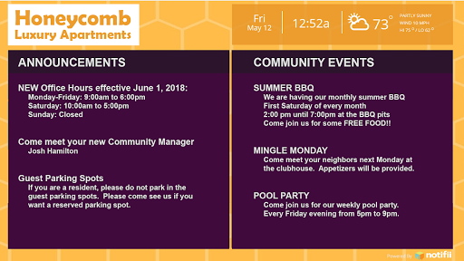 Perfect for a wall-mounted TV in your building lobby, leasing office, or other common areas. Customize the display with your property logo and local weather.