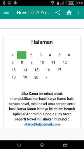 Jika Kamu berminat untuk mempublikasikan hasil karya Kamu baik berupa novel, mini novel atau cerpen serta hasil karya Kamu lainnya ke dalam bentuk Aplikasi Android di Google Play Store seperti Novel ini, silakan hubungi email kami : starcoklat@gmail.com