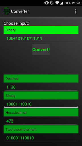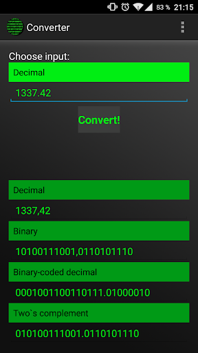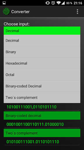- Converting numbers to decimal, binary, hexadecimal, octal, binary-coded decimal, two's complement and floating point numbers