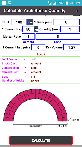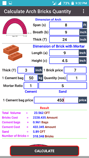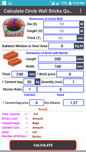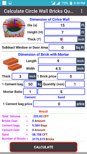 Bricks Calculator (Arch, Circle, Wall, Volume).