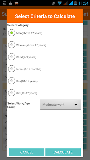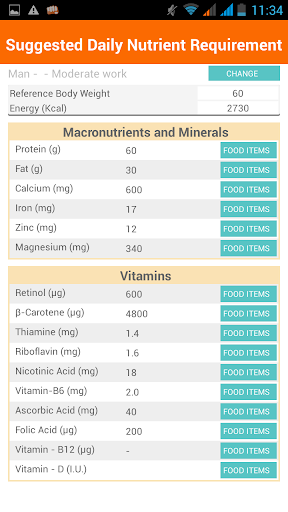 4. Recommended Nutrient Requirement: This tool suggests the nutrient requirements based on gender, age group and activity/work style. The suggested nutrition needs are based on a reference weight for each category.