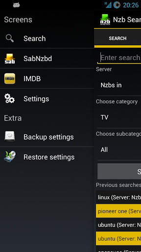 - Press the NzbSearcher icon to backup/restore settings and easily switch between screens