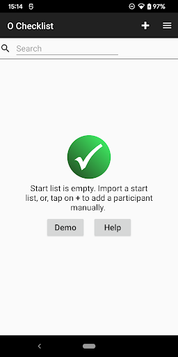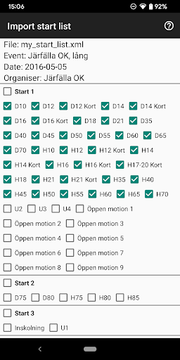 The checklist (the start list) is imported through an XML file in accordance with IOF Data Standard 3.0, or, through a CSV file.