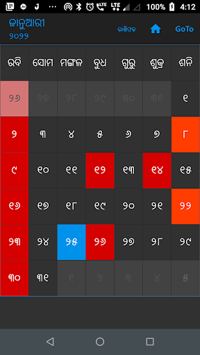 In our Odia calendar 2022 app you can go to a particular month and year, by tapping on corresponding menu on the action bar.