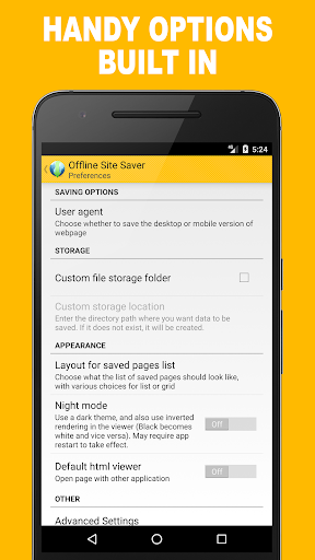 Handy settings such as choose between saving mobile or desktop version and night mode.