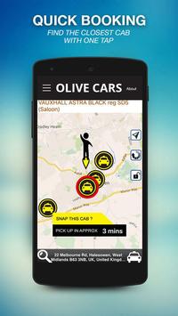 Olive Cars is an application that connects customers to taxis and cabs based on the availability and proximity of the vehicle to the passenger.