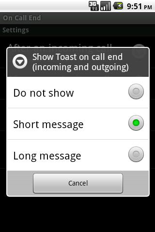 - Show a toast message with the call duration. Outgoing call duration includes the ringing time.