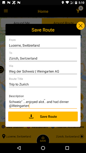 1. The app allows the user to search for interesting places around a specific route. Find “tourist attractions”, “restaurants”, “gas station”, and many more types of places along and around your entire route. For the first time an app will show you places all along your ROUTE and not just around a point or location.