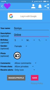 Well, when you first open the app, you can either log in with your Girls Live Video Talk account or complete a profile form to let others know a little bit more about you. The items in the profile are: Name, nickname, optional description about yourself, birthday, gender, and photo. You can also specify whether receiving comments or private messages are allowed or not.