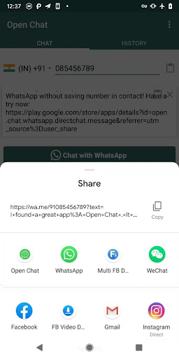 Open chat for WhatsApp without saving the number in contacts. Direct chat to anyone even yourself in WhatsApp or WhatsApp Business. Also you can create link for WhatsApp and share.