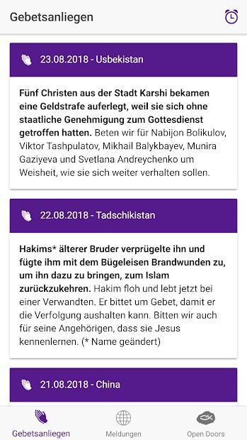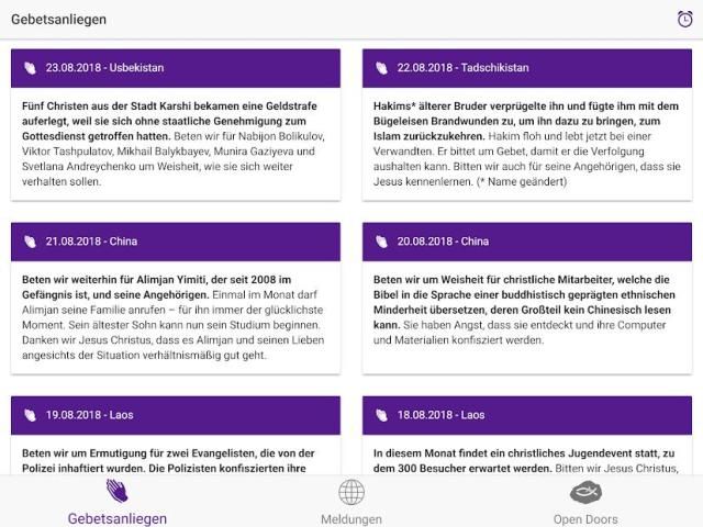 Mit der offiziellen App von Open Doors Deutschland wollen wir Ihnen ermöglichen, täglich auch unterwegs zielgerichtet für verfolgte Christen zu beten. Die App umfasst folgende Funktionen: