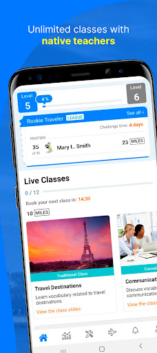 You will also find a game component, which will allow you to "travel" around the world while you learn English, make your process more fun, and stay motivated to meet your goal. Earn miles, earn badges, and be part of leagues in which you will compete with other students.