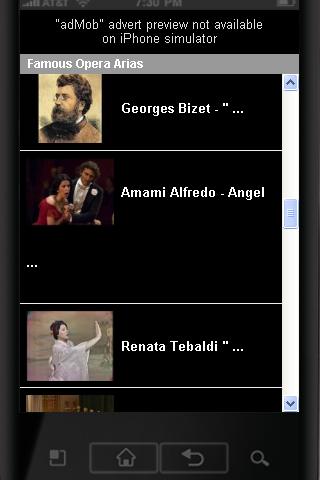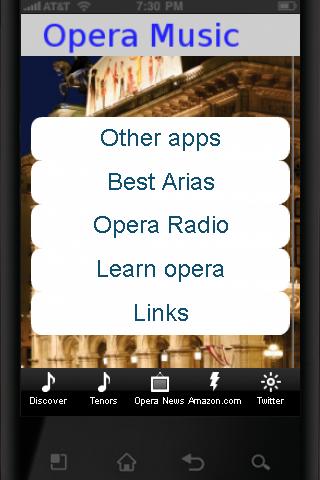Learn to love opera Love Opera MusicHere is a content rich application about opera:27 best and most wellknown operatic arias, such as:mario Del Monaco Nessun dorma Giuseppe Verdi Nabucco Chorus of the Hebrew Slaves from Akt III 1842 Maria CALLAS Puccini: La Boheme quot;MI CHIAMANO MIMI39;quot; Pavarotti Tosca E lucevan le stelle Giuseppe Verdi Aida Marcia Trionfale Triumphal March Gioachino Rossini : The Barber Of Seville Overture Luciano Pavarotti La Donna Mobile Rigoletto Pavarotti La Traviata Brindisi Luciano Pavarotti Figaro Georges Bizet quot;Les Toreadorsquot; from Carmen Suite No. 1 Amami Alfredo Angela Gheorghiu Renata Tebaldi quot;Un bel di vedremoquot; Tchaikovsky Pikovaya Dama Ya vas lyublyu Magic Flute Queen of Night Aria Sumi Jo Verdi Rigoletto Gilda Caro Nome Roth and Le Roi perform quot;Papagena Papagenoquot; MozartThe Marriage of Figaro Bartoli amp; Fleming Le Nozze di Figaro Sull39;aria Giuseppe Verdi Il Trovatore Il coro degli zingari Angela GHEORGHIU Habanera Carmen Bizet Rolando Villazon Una Furtiva Lacrima Sumi Jo Donizetti Lucia di Lammermoor Mad Scene Maria Callas O Mio Babbino Caro Giacomo Puccini Bizet: Carmen March of Toreadors and Chorus: Les voici Montserrat Caballe quot;Casta divaquot; Norma Orange 1974 Andrea Bocelli Nessun Dorma Enrico Caruso Vesti la giubba 1902, 1904, 19074 links to Internet radios that emit only opera music,Videos and texts how to learn opera and how to learn about operaSites of well known artistsSeries of videos quot;What makes a great tenor?quot; by BBCOpera news, a mashup of real time news about the most important artists of todayLinks for best buys on amazon com and links to our other apps and news about our apps through twitter This is an ideal app for beginners, to give to your children and make them love opera for life