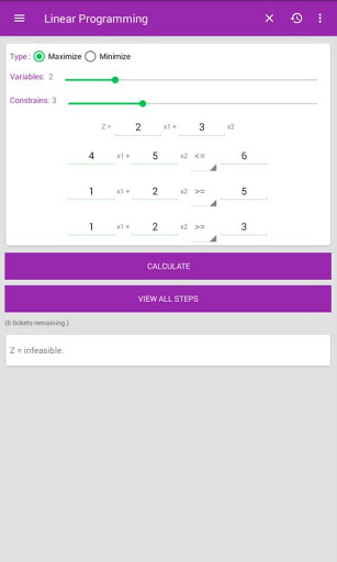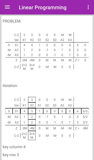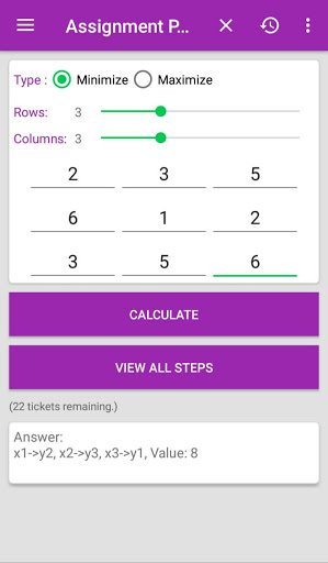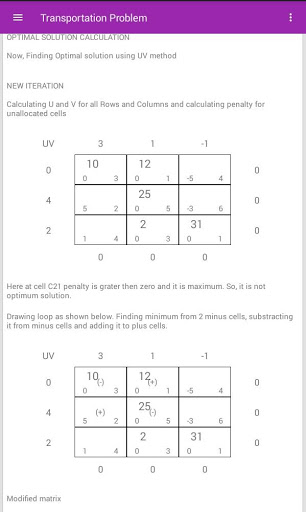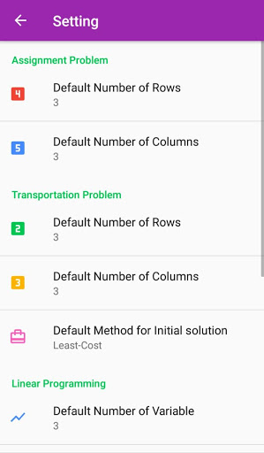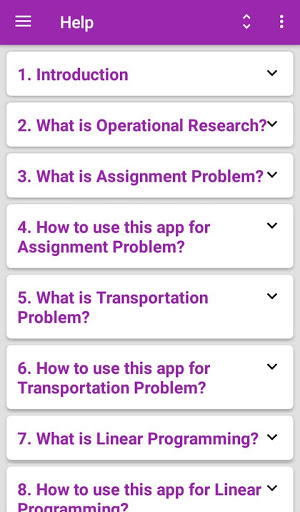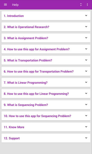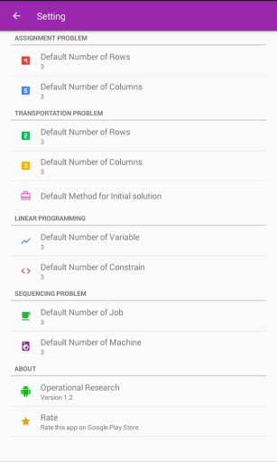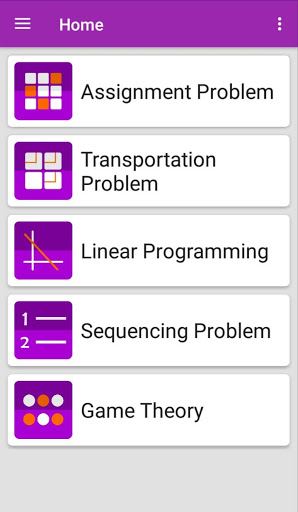 Welcome to Operational Research app. This app is Solver or Calculator. It is useful to solve following problems:(1)Assignment Problem (2)Transportation Problem (3)Linear Programming (4)Sequencing Problem (5)Game Theory. This app will solve all variety of these problems as well as shows STEP BY STEP solution.