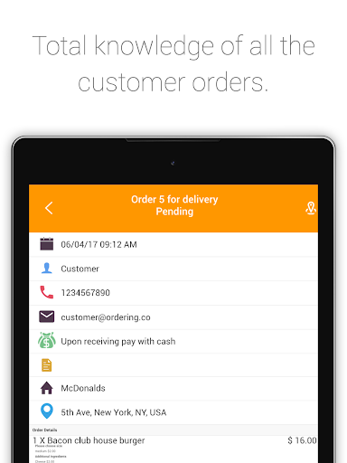 After clicking on the pending order, the tablet will display all relevant details concerning the order: customer details (name, phone number, address) and delivery details (address, etc.).