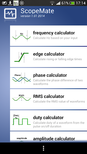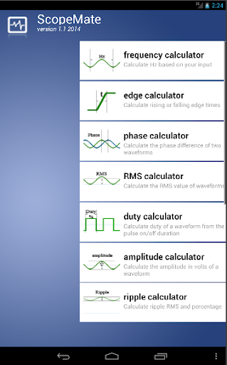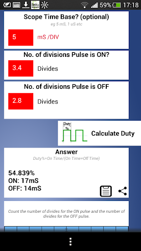 - Amplitude Calculator based upon voltage, number of divides and probe attenuation.