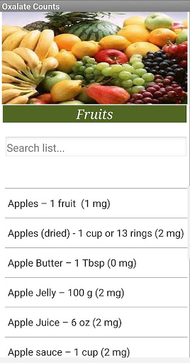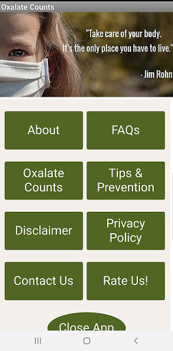 Overview:This easy to use app provides tips as well a quick lookup of food oxalate counts to aid individuals suffering from calcium oxalate kidney stones (nephrolithiasis) and hyperoxaluria or oxalosis who must restrict their oxalate intake. This app works offline and requires no internet connectivity once installed.