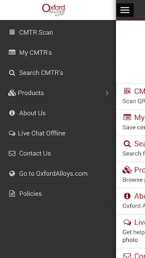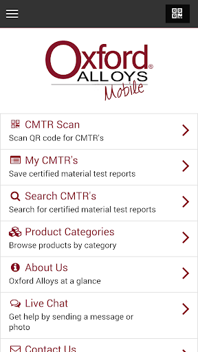 The Oxford Alloys Mobile app for Android is designed to deliver the information you need when you need it. Use the app to quickly scan product QR codes or use the search feature to find CMTR documents. Browse our product line, download and view catalog pages or chat with our experts in real-time.