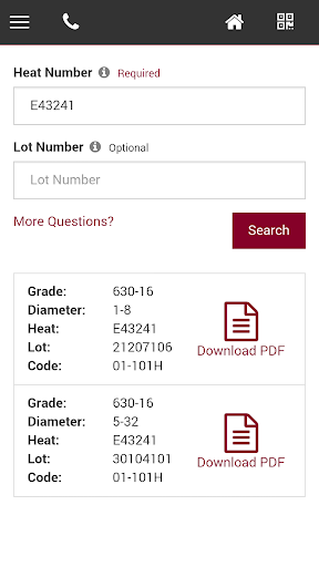 • Search CMTR's — Search for CMTR's using Heat and Lot numbers.