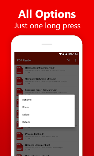 🛠️ Essential Options: The PDF Viewer app comes with all the necessary options like Renaming, Deleting, Sharing etc.