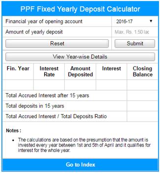 PPF Fixed Yearly Deposit Calculator : Use this calculator to check year-wise interest and maturity amount for fixed amount of annual contribution. The calculator takes into account applicable rate of interest automatically depending upon the month/year of opening of account. The calculator is based on the presumption that contribution is made between 1st and 5th of April every year, so that the contribution qualifies for interest for the year of contribution.