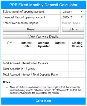 PPF Fixed Monthly Deposit Calculator : Use this calculator to check year-wise interest and maturity amount for fixed amount of monthly contribution. The calculator takes into account applicable rate of interest automatically depending upon the month/year of opening of account. The calculator is based on the presumption that contribution is made between 1st and 5th of the month, so that the contribution qualifies for interest for the month of contribution.
