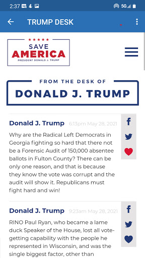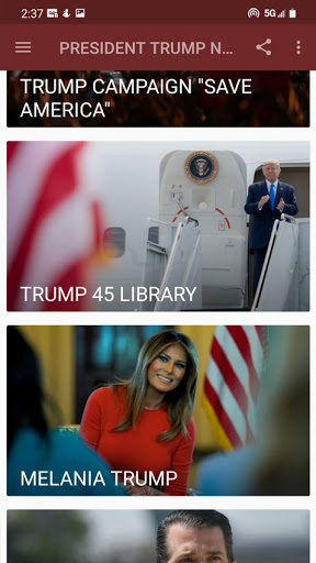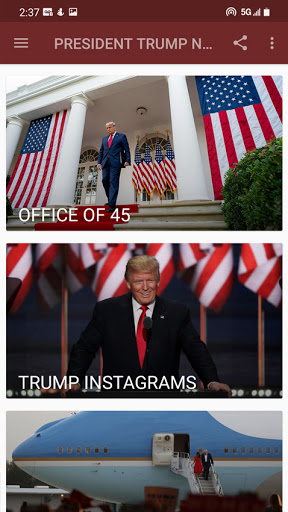 The #1 TRUMP APP Since 2015 , During the 2016 Election, as Donald Trump Served as the 45th President of the United States of America, During the 2020 Election and Now . We have worked hard to reach over 20 Million Supporters with this app and to get you directly to TRUMP'S message at a tap. We Help Bypass the Mainstream Media and Social Media Platforms that block updates from your timeline and makes sure you dont miss an update from our President. This App includes Official Accounts, Links, Pages, Resources, Mainstream Media Feeds and more.