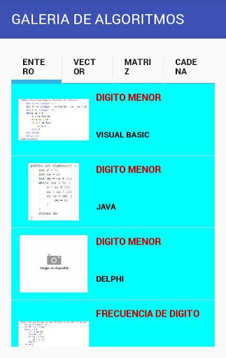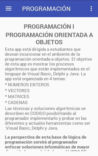 El objetivo de esta app es mostrar los procesos algorítmicos que están implementados en el lenguaje de Visual Basic, Delphi y Java.